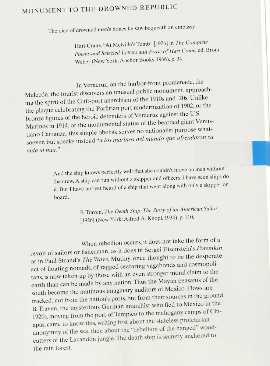 In the photographic essay book, Fish Story Allan Sekula investigates the invisibility of the maritime space on earth. Sekula photographs ship workers, he writes poetry based on their testimony and tabulates historical essays about what he calls The Forgotten Space. In this poem Sekula engages with a monument to the dead: