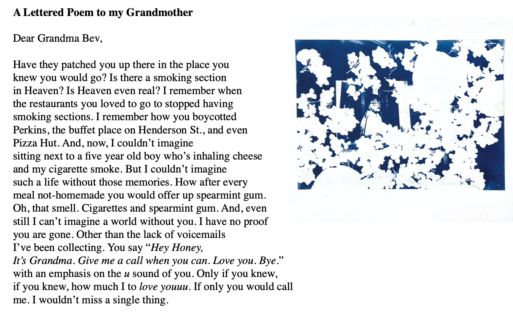 There aren’t many pictures of Bev and the pictures that do exist are ones that I imagine she wasn’t all too happy to be a part of. Over and over again her gaze seems to criminalize the act of the photograph. In the moments where the nameless or unknown camera operator claims her body in the gestural manner of photography, Beverly seems to be in transition, or more often a disposition. The details of the pictures themselves don’t leave much to garner about any of the artifacts or production of the image. Just like when grandma Bev passed away alone in a hospital bed in Peoria at the early height of a pandemic these photos leave more questions than answers. More pondering than closure. I’ve been having family members send me photos of Bev. Which I have been scanning and creating digital negatives out of and then creating cyanotypes. But why? What the hell for?
